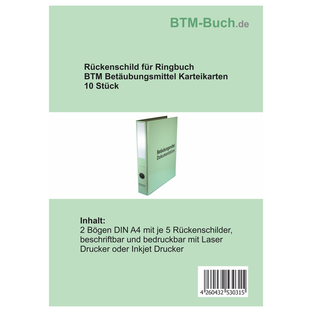 10 Rückenschilder für Ringbuch für BTM Betäubungsmittel Karteikarten, 2 Bögen DIN A4 mit je 5 Rückenschilder, beschriftbar und bedruckbar mit Laser Drucker oder Inkjet Drucker. Maße des einzelnen Rückenschildes 145 x 34 mm.