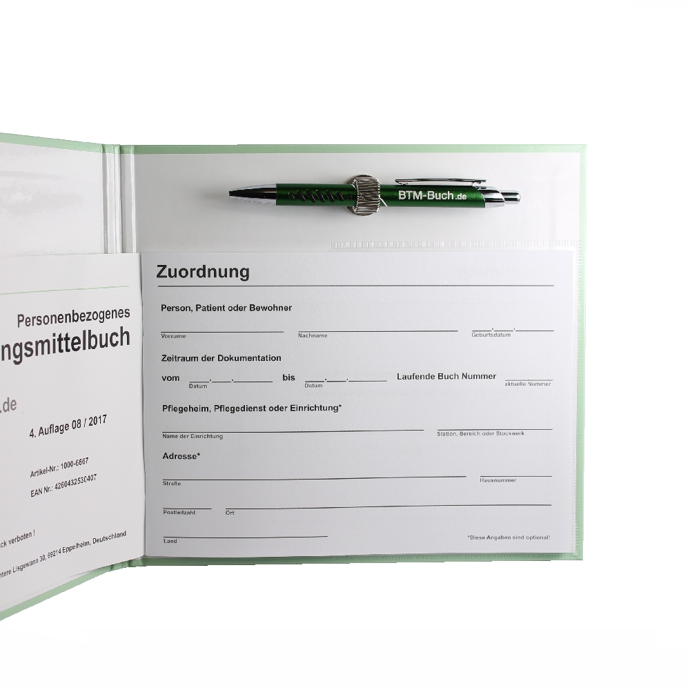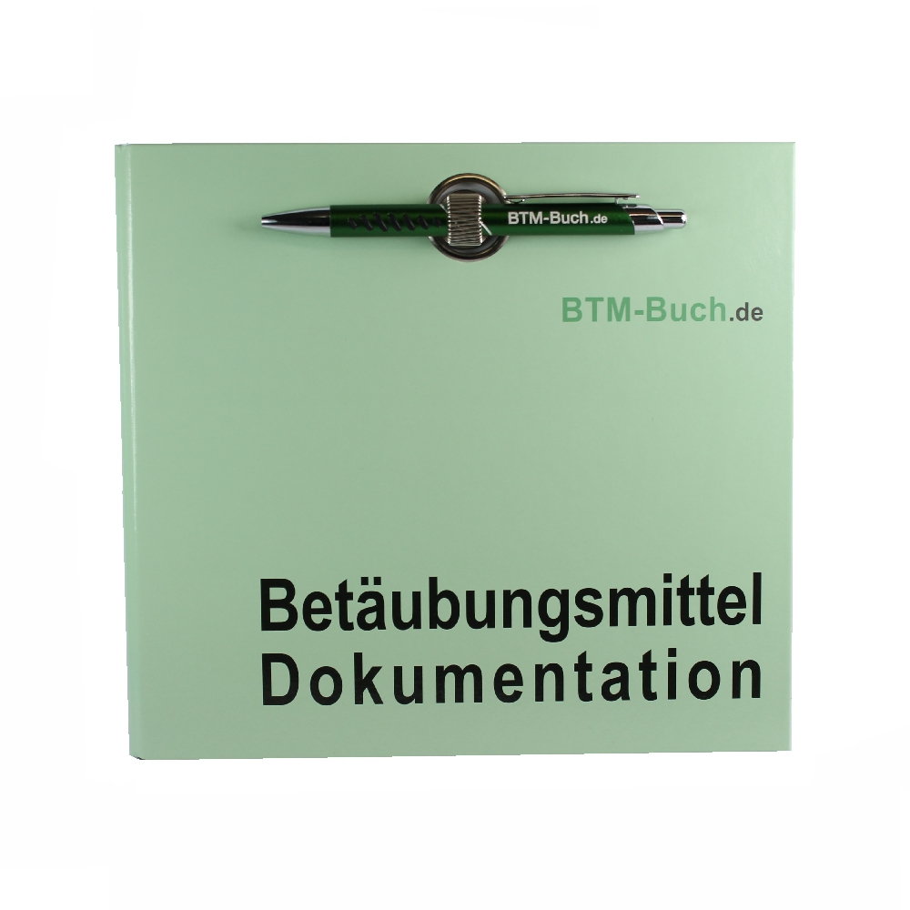 Schreibmappe für Personenbezogenes BTM Buch, Übergabebuch BTM Tresorschlüssel und Kleines Betäubungsmittelbuch, Sonderformat mit Höhe 20,5 cm, Länge 22 cm, Breite 0,9 cm, mit BTM-Buch.de Metall-Kugelschreiber, Metall-Stiftehalter und 2 verschweißten Taschen.